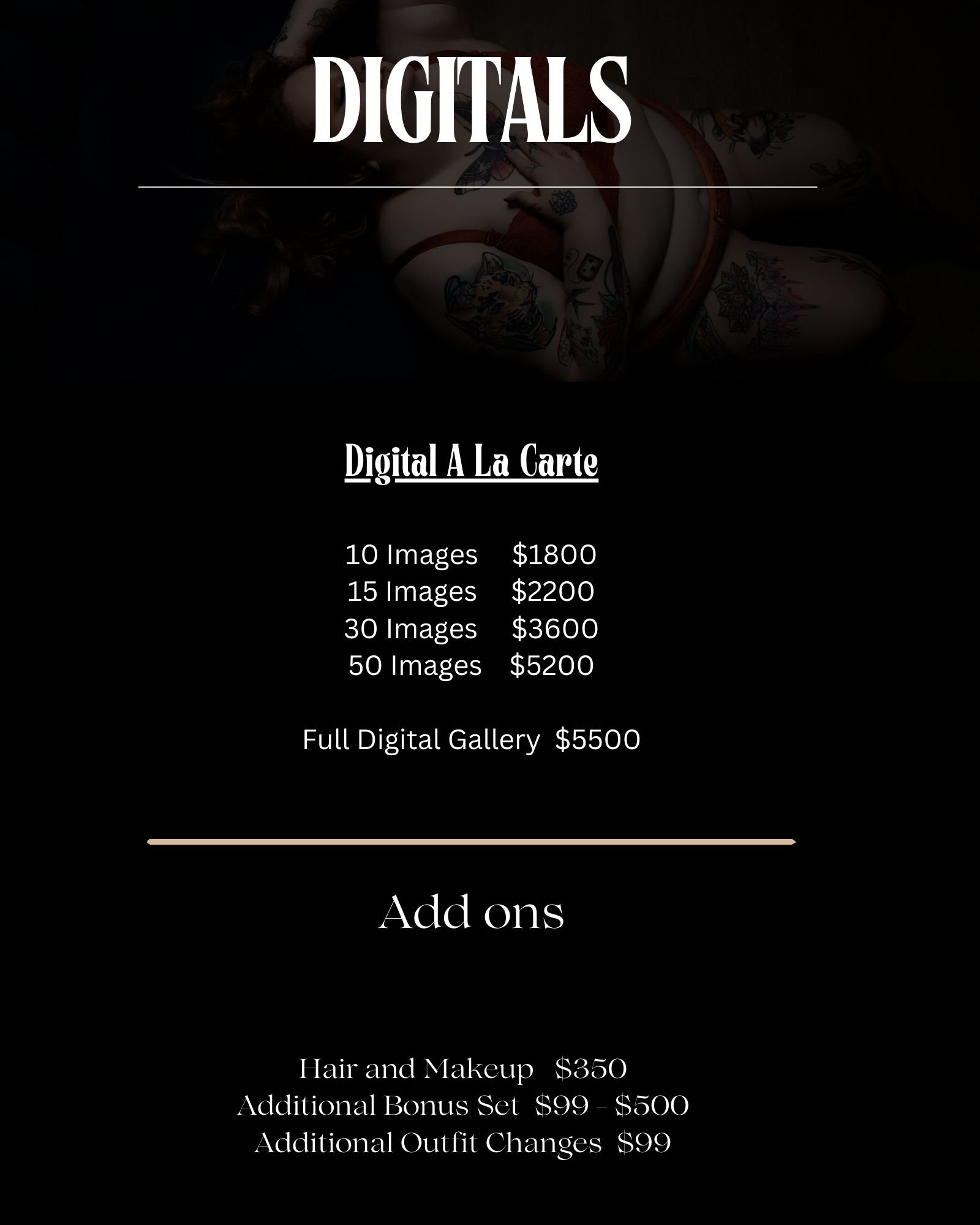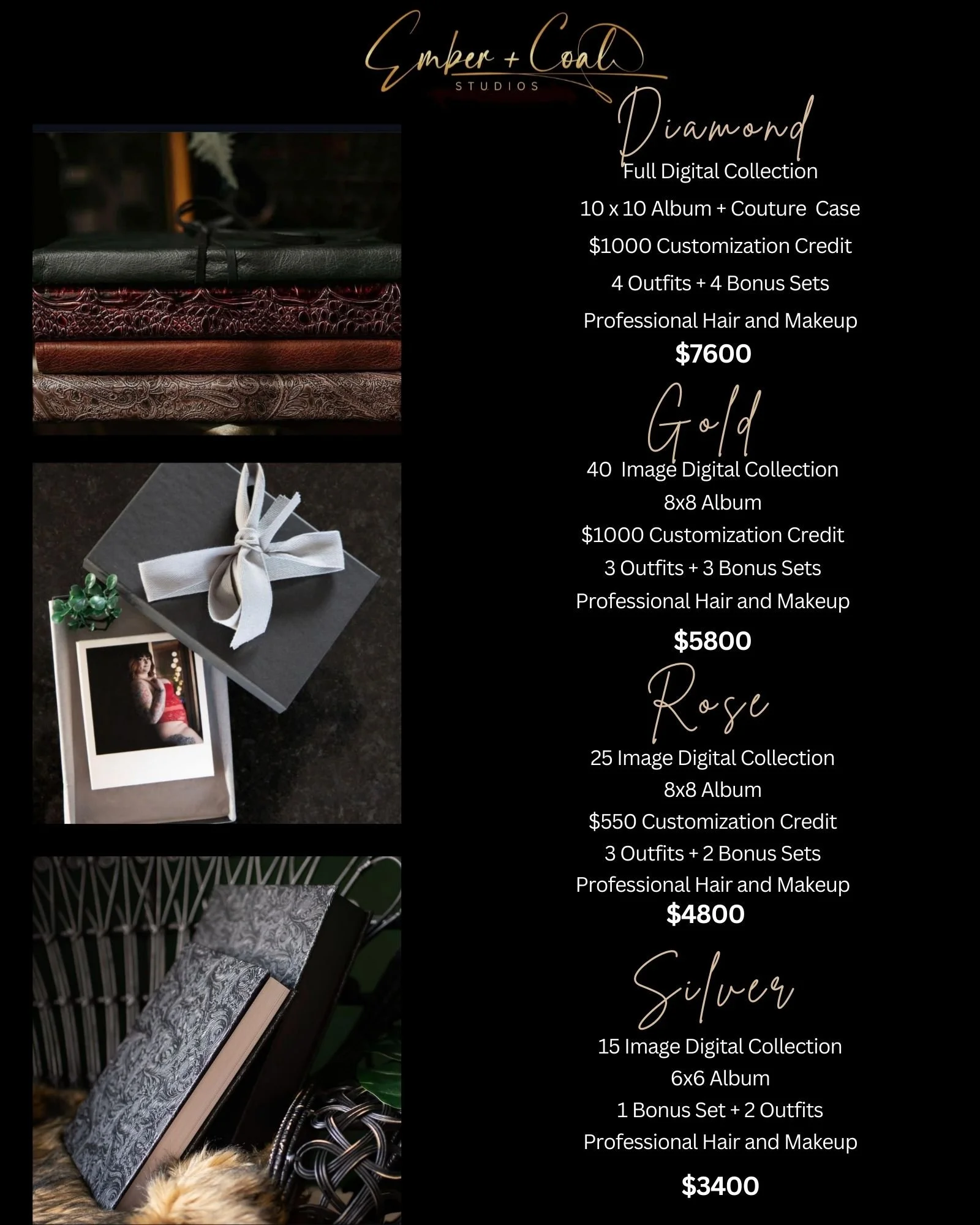 Create your Payment Plan Investment Calculator Choose Your Collection 10 Images — $1800 15 Images — $2200 30 Images — $3600 50 Images — $5200 Full Digital Gallery — $5500 Silver Collection — $3400 Rose Collection — $4800 Gold Collection — $5800 Diamond Collection — $7600 Optional Upgrades Polaroid Set — $350 Glass Block — $699 Accordion Pack (2 Books) — $699 Hair & Makeup — $350 Include Session Fee ($499) $ Discount % Discount Payment Frequency Bi-Weekly Payments Monthly Payments Total Investment Payment Plan